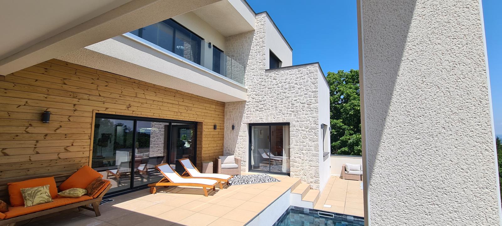 Les lignes architecturales sont sobres et épurées, soulignant la modernité de l’ensemble recherchée par le maitre d’ouvrage. L’orientation des espaces de vie a été pensée pour que chaque ouverture encadre la beauté du panorama, véritable tableau vivant au fil des saisons.